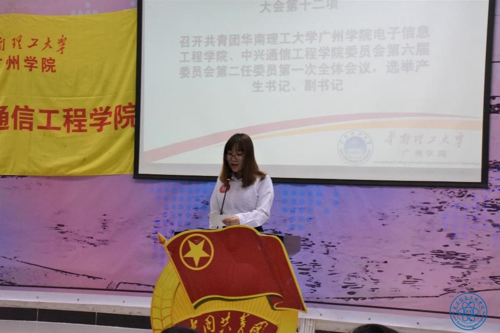 经过短暂的委员第一次全体会议后,由杨多佳同学宣布共青团华南理工大学广州学院电子信息工程学院、中兴通信工程学院委员会第六届委员会第二任委员第一次全体会议选举结果:陈诗萌、乔艳、谢丽任教师兼职副书记;许莘杰、杨多佳任学生兼职副书记。
