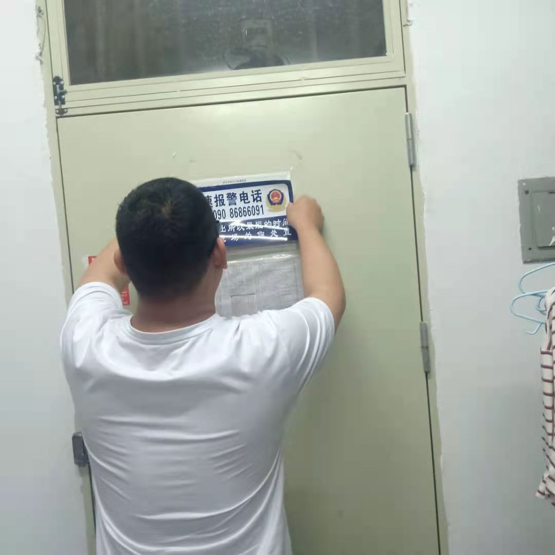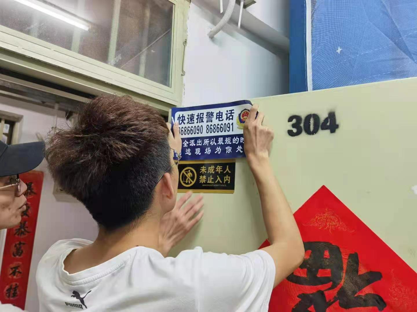 学生党员深入班级同学宿舍,为同学们张贴“防诈骗宣传单”,提醒同学们提高防诈反诈意识。