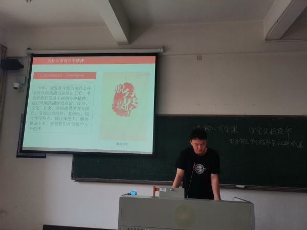 接着由明山钧同志回顾了党的十八大、十九大等重要会议中所提及的斗争精神,解析了“敢于直面矛盾、敢于较真碰硬、敢于担当尽责、敢于赢得胜利的精神状态,迎难而上、攻坚克难、谨山开路、遇水架桥的坚定信念”的新时代斗争精神的含义。并从个人发展角度、目前面临的情况以及长远布局三个方面介绍了发扬斗争精神的重大意义。习总书记也曾指出:社会是在矛盾运动中前进的, 有矛盾就会有斗争,中华民族伟大复兴,绝不是轻轻松松、敲锣打鼓就能实现的,实现伟大梦想必须进行伟大斗争。