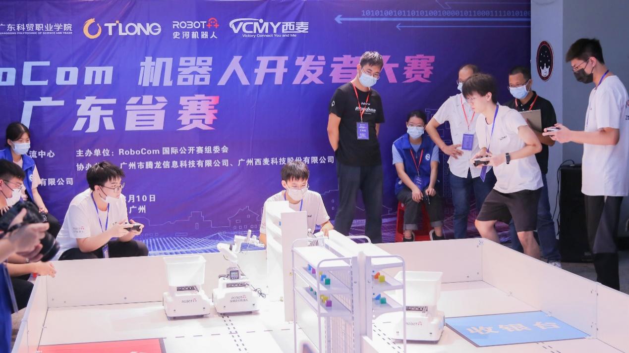 本次比赛由RoboCom国际公开赛组委会主办,广东科贸职业学院承办,广州市腾龙信息科技有限公司、广州西麦科技股份有限公司共同协办,深圳史河机器人科技有限公司担任技术支持单位。比赛设本科组和高职组,吸引省内9所高校的22支队伍近百名参赛选手齐聚赛场。竞赛项目为智慧零售,要求参赛队伍要完成程序调试、机器人测试和走位、视觉抓取等环节,参赛双方同时遥控机器人到队伍和公共货架区域进行视觉抓取,抢夺积木后投放至载物机器人,是一个完整智慧零售场景的任务。经过前期的调试和训练,我校参赛队员之间默契十足,机器人像被赋予生命力,机械臂灵活地摆动起来,精准抓取积木,一气呵成完成预定任务。