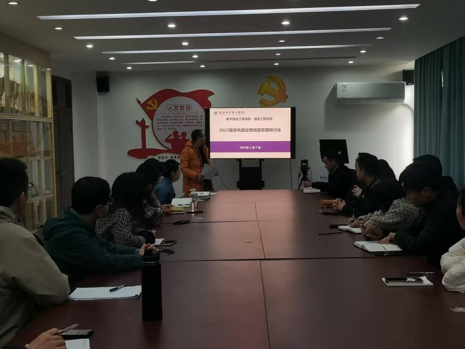 本网讯(记者 周雨轩)为加强年级学风建设,提升班级管理水平,给学生创造更优质的学习环境,电子信息工程学院/通信工程学院3月7日,在B6-503召开2023级学风建设暨班级管理研讨会。学院常务副书记罗自力、学院副院长曹英烈、2023级全体辅导员及班主任参加了此次会议。