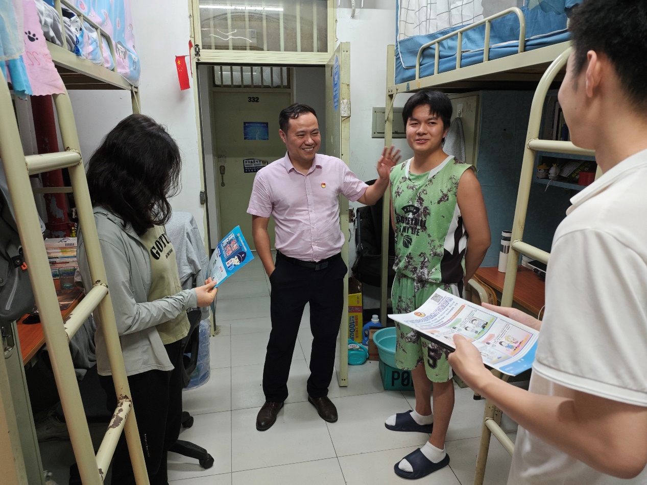 走访过程中,罗自力与同学们亲切交流,关怀学生生活,关心学生身心健康状况,了解学生住宿情况,细心叮嘱同学们谨防电信诈骗,注意人身及财产安全;其次,针对即将到来的五一假期,提醒学生出行期间注意安全、遵守交通规则、保管好个人财物,避免前往危险区域,做到“平安出行,安全返校”;最后,勉励同学们要勤奋学习,做好学习规划,引导同学们做新时代好青年。
