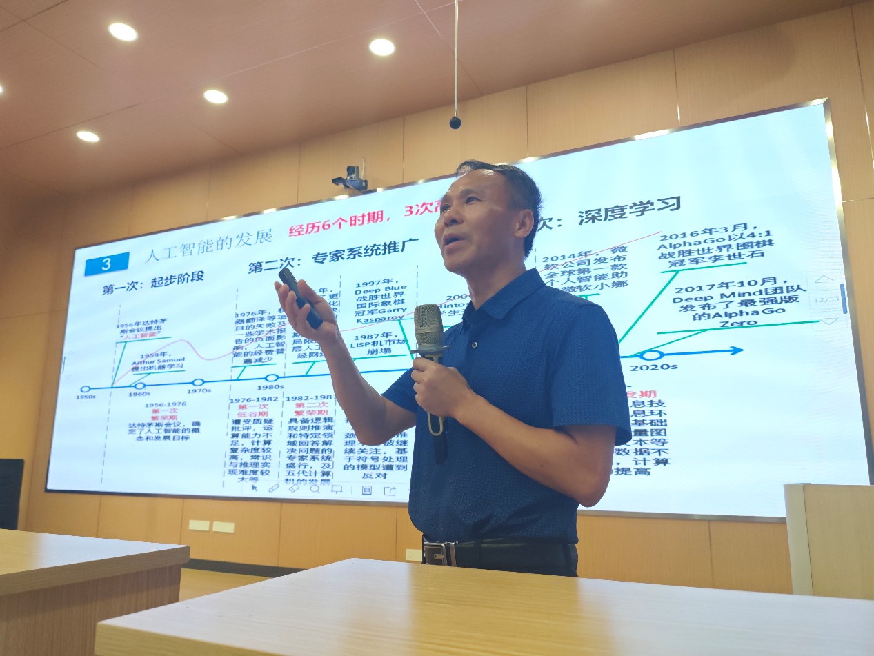 讲座中,肖平教授立足科技前沿,系统阐述了人工智能技术发展的历程、深度学习核心原理及对人类社会各领域的影响。他将高深的理论知识与日常生活场景巧妙结合,特别引用央视春晚亮相的机器人舞蹈表演作为案例。当大屏幕播放机器人整齐划一、充满科技美感的舞姿时,现场学生们惊叹不已。这一案例,将抽象的人工智能概念具象化,极大激发同学们对AI技术的兴趣与热情。讲座现场,学生们踊跃提问,肖平教授对同学们的问题一一进行了解答。肖教授以深厚的专业素养和富有感染力的表达,将科技的种子播撒进同学们的心中。讲座最后,肖平教授鼓励同学们,要保持对知识的渴望和对新事物的探索精神,不要满足于现状,要勇于挑战自己,不断追求进步。