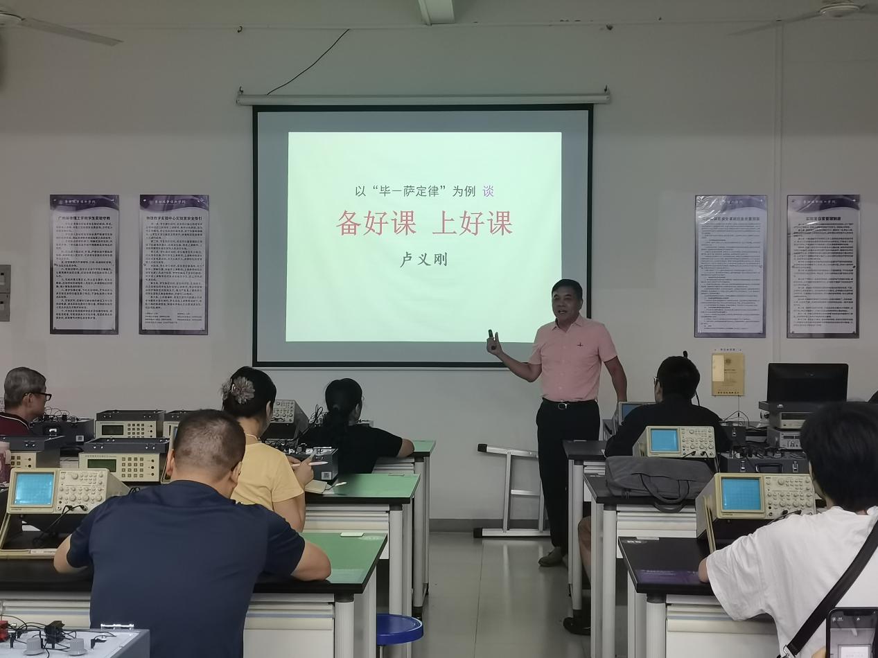 本次示范课由物理教学实验中心主任卢义刚教授担任主讲人。他以“以‘毕-萨定律为例’,谈备好课、上好课”为主题,结合自身多年教学实践,向在场教师生动且细致地分享了丰富的教学经验与独到的授课心得。他从精准定位每堂课内容在整门课程中的定位、课前准备互动问题、明确教学目标、规划教学内容、合理结合AI辅助、精确时间安排、恰当融入课程思政元素、经典案例分析、新物理量拓展、课堂练习、对称性思维拓展等十个方面,对“毕-萨定律”这一堂课的知识进行了精准剖析和讲解。为让教学方法更具可操作性,卢教授还通过具体案例进行生动演示与深入阐述:例如,通过电场和磁场的同步类比、帮助学生借助已知知识理解未知概念,降低学习难度;以生动有趣的文学诗词引入 “卢瑟福实验”,打破学科壁垒,让抽象的物理实验更具文化韵味与吸引力;通过 “一步一动” 的多媒体动态演示,将复杂的物理过程可视化,助力学生快速把握核心原理;同时,采用启发式互动交流方式,引导学生主动思考、积极提问,营造活跃的课堂氛围。