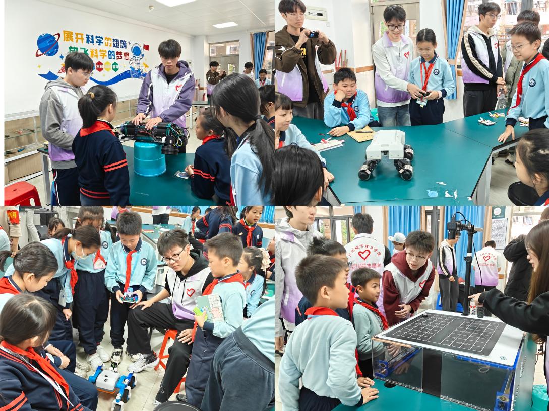 手工结束后,大学生们向大家展示了学校实验室的各类机器人,吸引小学生们围拢上前观摩,眼神里满是好奇。大学生耐心地对机器人功能进行讲解,小学生们一边认真听,一边自己上手尝试操控机器人,在他们踊跃提问的身影里,藏着对科技世界的无限向往。