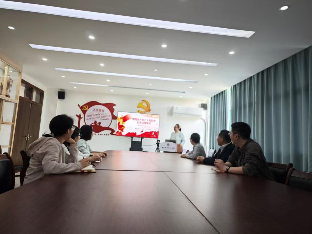 学校党建思政育人基地参观完毕后,教工第二党支部在B6-503会议室举办学习贯彻党的二十届四中全会精神会议,会议由党支部书记聂茹同志主持,教工第二党支部副书记陈雪娇同志领学了全会精神与“十五五”规划要点。
