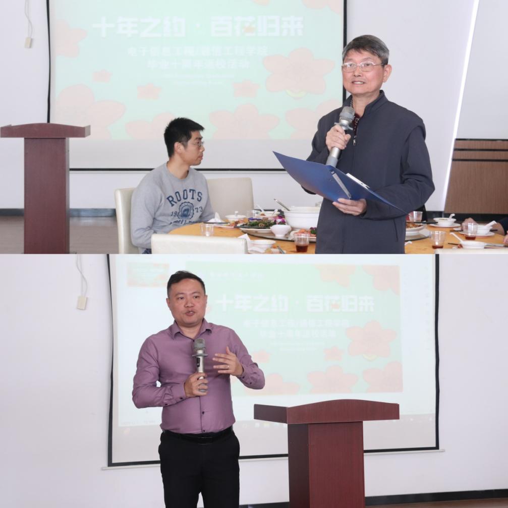 午间,学院在第四饭堂布置团圆宴聚,姚若河代表学院致辞,热烈欢迎2015届校友荣归母校,感谢校友长期以来对学院发展的关心支持,简述学院学科建设、教学科研、人才培养等方面的显著进展,并展望发展蓝图,期待与校友携手共进。随后,班导师代表先后发言,回顾师生共处时光,祝贺校友在各领域取得的优异成就,勉励大家不忘初心、砥砺前行。现场播放了未能亲临的恩师们录制的祝福视频,更有退休的老教师方昌始远在新加坡为校友们送上视频祝福,真挚寄语让校友们深受触动,重温师生情谊。校友代表上台分享了返校的激动心情与奋斗感悟。宴会期间,校友们也向恩师们汇报了工作岗位的阶段性成绩,目前他们有在电信、通信行业的高管,有在各行各业努力创业打拼,也有在通信运营商做技术骨干,老师们对学生的成绩深感欣慰。