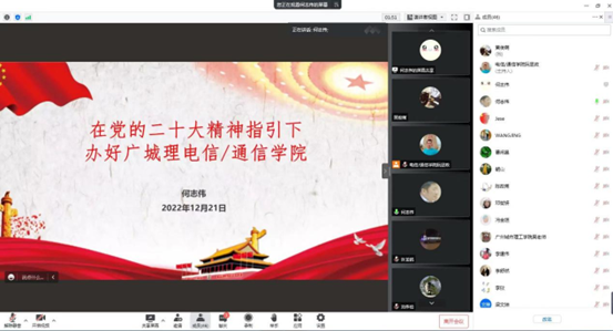 本网讯(记者 马小淑)为深入学习贯彻党的二十大精神,以实际行动推动党的二十大精神落实见效,12月21日下午,电子信息工程学院/通信工程学院院长何志伟进行党的二十大精神专题宣讲,学院全体教职工线上参会学习。