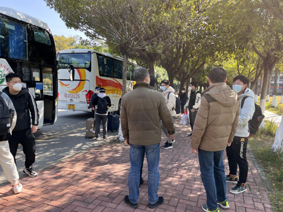 学院领导、老师提前来到现场,指挥送考车辆在行政楼对面的马路上等待着考生到来,并指引考生乘车,提醒他们乘车注意事项,叮嘱大家要带好考试证件、文具等,勉励考生们积极调整心态,沉着冷静应考。一句句关怀和鼓励,让考研学子深深感受到来自学院的温暖。随后,两辆载着考研学子的大巴车缓缓从学校行政楼前广场启动,向着学校大门的方向驶去。广场上送行的人员和车内的学子频频挥手致意。
