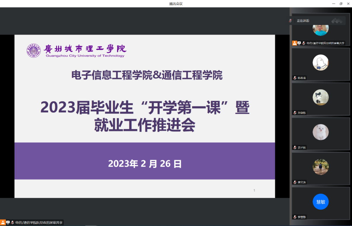 本网讯(记者阮显政)为深入学习贯彻党的二十大精神,落实立德树人根本任务,引导2023届毕业生以良好的心理状态和积极的精神面貌迎接新学期的到来,推进学生顺利毕业与就业,226日晚,电子信息工程学院/通信工程学院线上举办2023届毕业生开学第一课暨就业工作推进会。学院学生工作办公室相关负责人,2019级辅导员,教务员以及2023届全体毕业生参加会议。